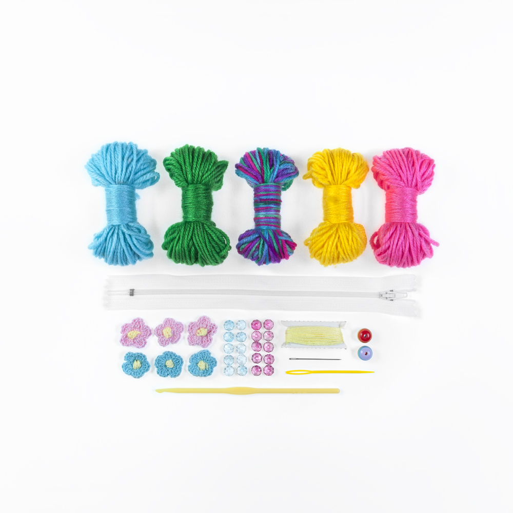 Размер упаковки (ШхГхВ): 22 х 3,5 х 18 см. Состав набора: пряжа, молния, вязаные цветы, бусинки, крючок пластиковый, игла металическая, игла металическая, инструкция.
