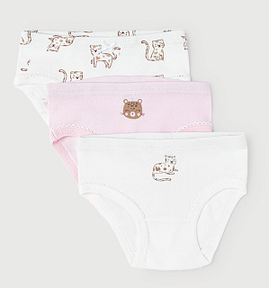 Трусы для девочки из хлопкового трикотажа рибана-пенье. На поясе и проймах декоративная эластичная тесьма. Двойная ластовица. В упаковке 3 штуки.Состав: 100% хлопок.