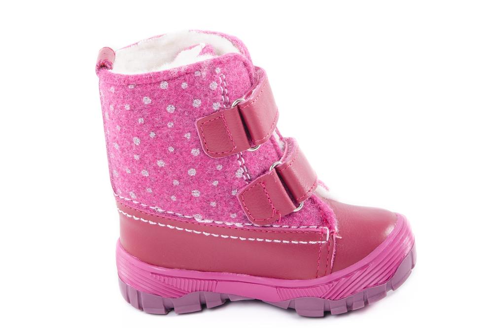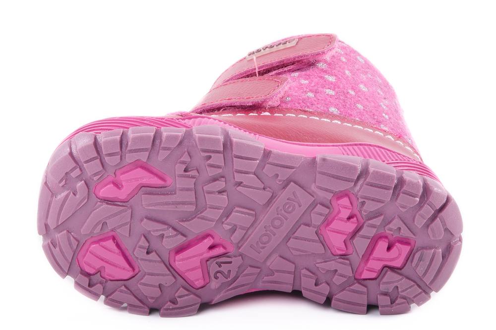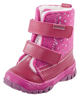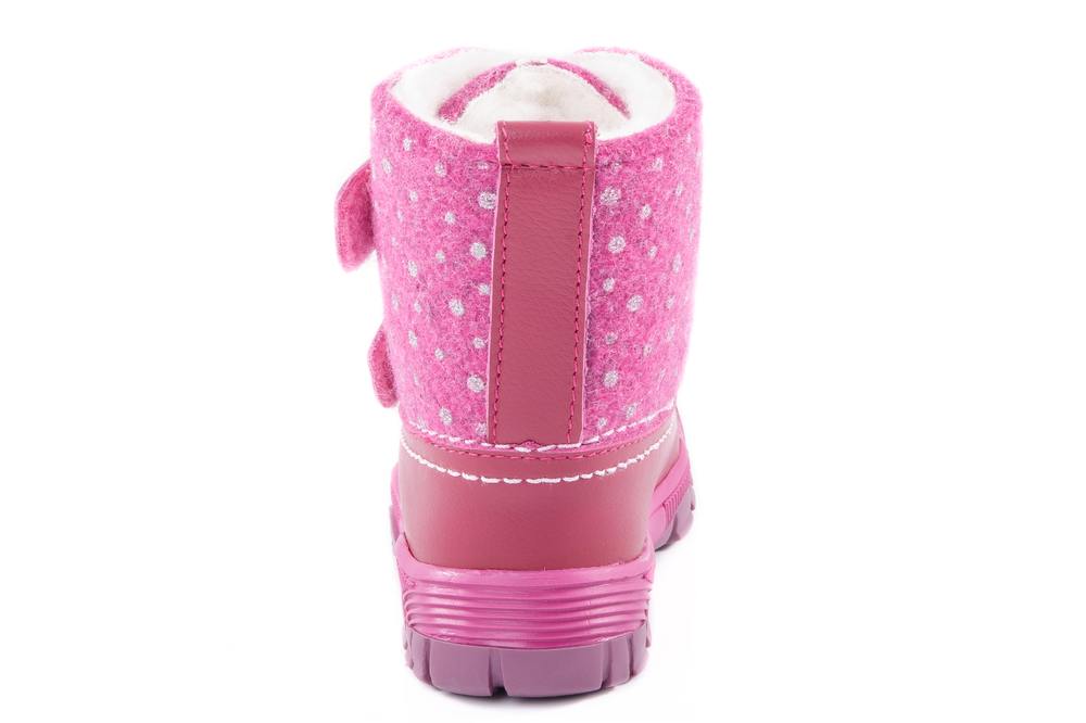 Ботиночки цвета фуксия. Материал верха «микс» гладкой, натуральной кожи и итальянского войлока с мульти оттеночной структурой. При такой комбинации натуральная кожа играет роль практичного защитника от зимней грязи, реагентов и прочего, а войлок успешно участвует в воздухообмене, создавая благоприятный микроклимат внутри ботинка. Подошва модели клеевая с характерным для времени года агрессивным протектором, широкая, мыс защищён. Материал подкладки - шерстяной мех из натуральной овечьей шерсти отлично сохраняет тепло, отводит влагу от ноги, придает дополнительный комфорт. На ноге модель фиксируется с помощью 2-ух липучек, что придаёт максимальную раскрываемость и идеально подходит для ножек с высоким подъёмом.