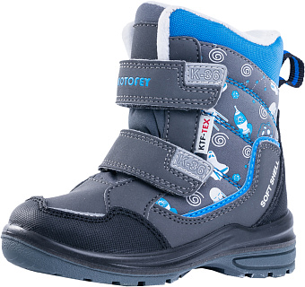 Ботинки из комбинированных материалов верха с использованием мембранной технологии позволят ножкам оставаться сухими в сырую погоду. Модель выполнена в сером цвете с добавлением голубого цвета в отделках и подкладке. Материал верха - водоотталкивающая ткань, дублированная мембранным материалом. Носочная часть, задник и берец усилены дополнительными кожаными деталями, повышающими износостойкость. Легкая и гибкая литьевая подошва создает повышенную комфортность. Подкладка - утеплённая, из шерстяного меха. На ноге модель фиксируется с помощью 2-ух липучек, что придаёт ей максимальную раскрываемость и идеально подходит для ножек с высоким подъёмом.Особенно хороши для активных прогулок.