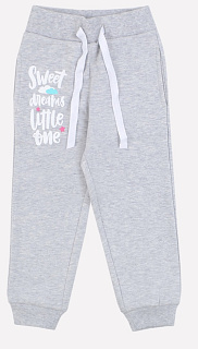 Брюки для девочки из меланжевого футер начёса, пояс и манжеты из кашкорсе, в поясе эластичная тесьма, киперная лента, карманы в боковых швах, печать на передней половинке.