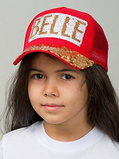 Кепка для девочек из сетки. Верх козырька из золотых переворачивающихся пайеток. Нашивка из двусторонних пайеток. Перевод Красавица.