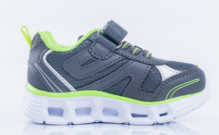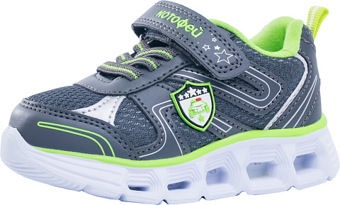 Кроссовки для мальчиков выполнены из высококачественных комбинированных материалов. Они дышащие, легкие, удобные. Текстиль для верха имеет сетчатую структуру. Материал подошвы - филон,очень лёгкий и пружинистый материал. Метод крепления подошвы - клеевой. Кроссовки оснащены мигающими лампочками с яркими светодиодами. Лампочки включаются датчиком, реагирующим на ударные нагрузки, возникающие при ходьбе. Модель фиксируется на ноге при помощи велькро и резинки. Подкладка из текстиля с одержанием хлопка не менее 80% обеспечит ногам комфорт и уют. Кожаная формованная стелька обладает гигроскопичными свойствами. Верх модели дополнен светоотражающими вставками, что повышает безопасность в темное время суток.