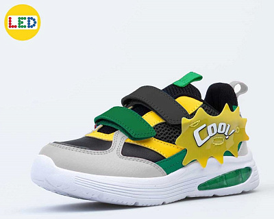 Кроссовки для мальчика с верхом из комбинации высококачественной искусственной кожи и текстильного материала. -Все ответственные детали верха: носочная часть, элементы крепления и часть задника из высококачественной искусственной кожи комбинированы менее ответственными деталями из текстильных материалов. - Застёжка - два \'велькро\' позволяют отрегулировать обувь по полноте и правильно зафиксировать ее на стопе. - Мягкий манжет создает комфорт при ходьбе и предотвращает натирание ножки ребенка. -Подкладка и стелька из текстиля обеспечивает ногам комфорт и уют. - Материал подошвы очень лёгкий и пружинистый материал, а накладка обеспечивает надежное сцепление с любой поверхностью и защищает от скольжения во время движения. -Ударная нагрузка: Кроссовки оснащены мигающими лампочками с яркими светодиодами. Лампочки включаются датчиком, реагирующим на ударные нагрузки, возникающие при ходьбе. Модные отделки придают обуви стильный современный вид.Они подходят для комфортного использования, как в спортзале, так и на улице.