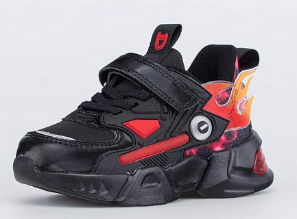 Кроссовки для мальчика с верхом из комбинации высококачественной искусственной кожи и текстильного материала с яркими декоративными вставками. -Все ответственные детали верха: носочная часть, элементы крепления и часть задника из высококачественной искусственной кожи комбинированы менее ответственными деталями из текстильных материалов. - Застёжка - \'велькро\' и шнуровка позволяют отрегулировать обувь по полноте и правильно зафиксировать ее на стопе. - Мягкий манжет создает комфорт при ходьбе и предотвращает натирание ножки ребенка. -Подкладка и стелька из текстиля обеспечивает ногам комфорт и уют. - Материал подошвы очень лёгкий и пружинистый. -Ударная нагрузка: Кроссовки оснащены мигающими лампочками с яркими светодиодами. Лампочки включаются датчиком, реагирующим на ударные нагрузки, возникающие при ходьбе. Модные отделки придают обуви стильный современный вид.Они подходят для комфортного использования, как в спортзале, так и на улице.
