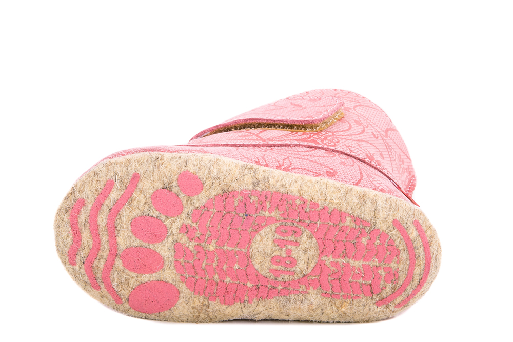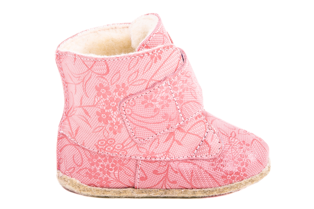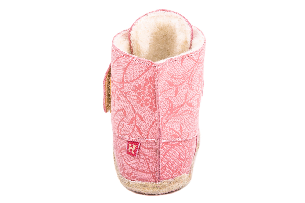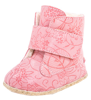 Пинетки из натуральной кожи. Материал подкладки - шерстяной мех из натуральной овечьей шерсти отлично сохраняет тепло, отводит влагу от ноги, придает дополнительный комфорт. На ноге модель фиксируется с помощью липучки. На подошве для придания сцепления с напольной поверхностью нанесён специальный выпуклый рисунок.