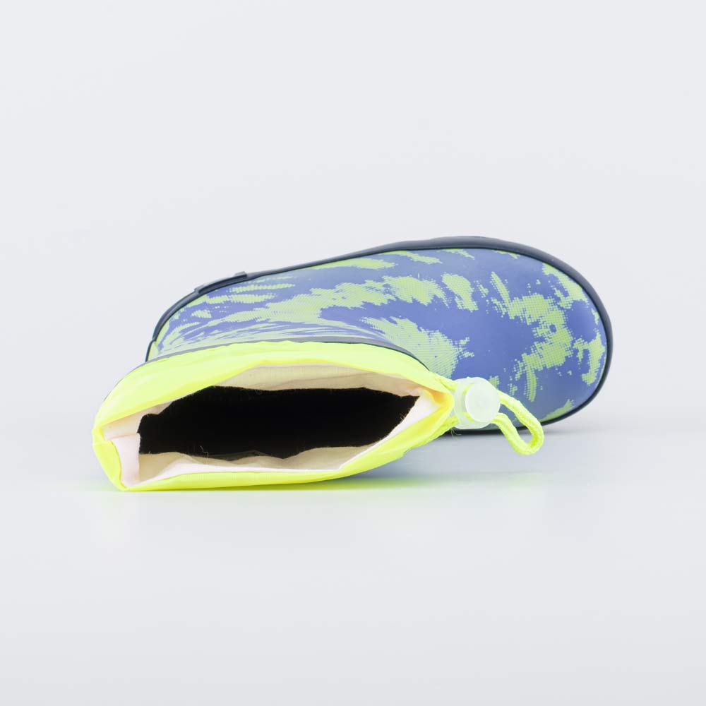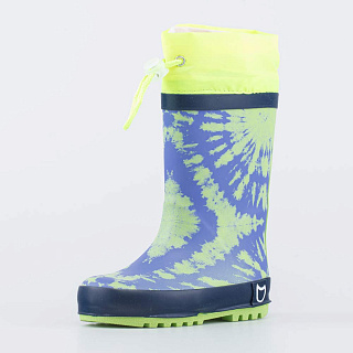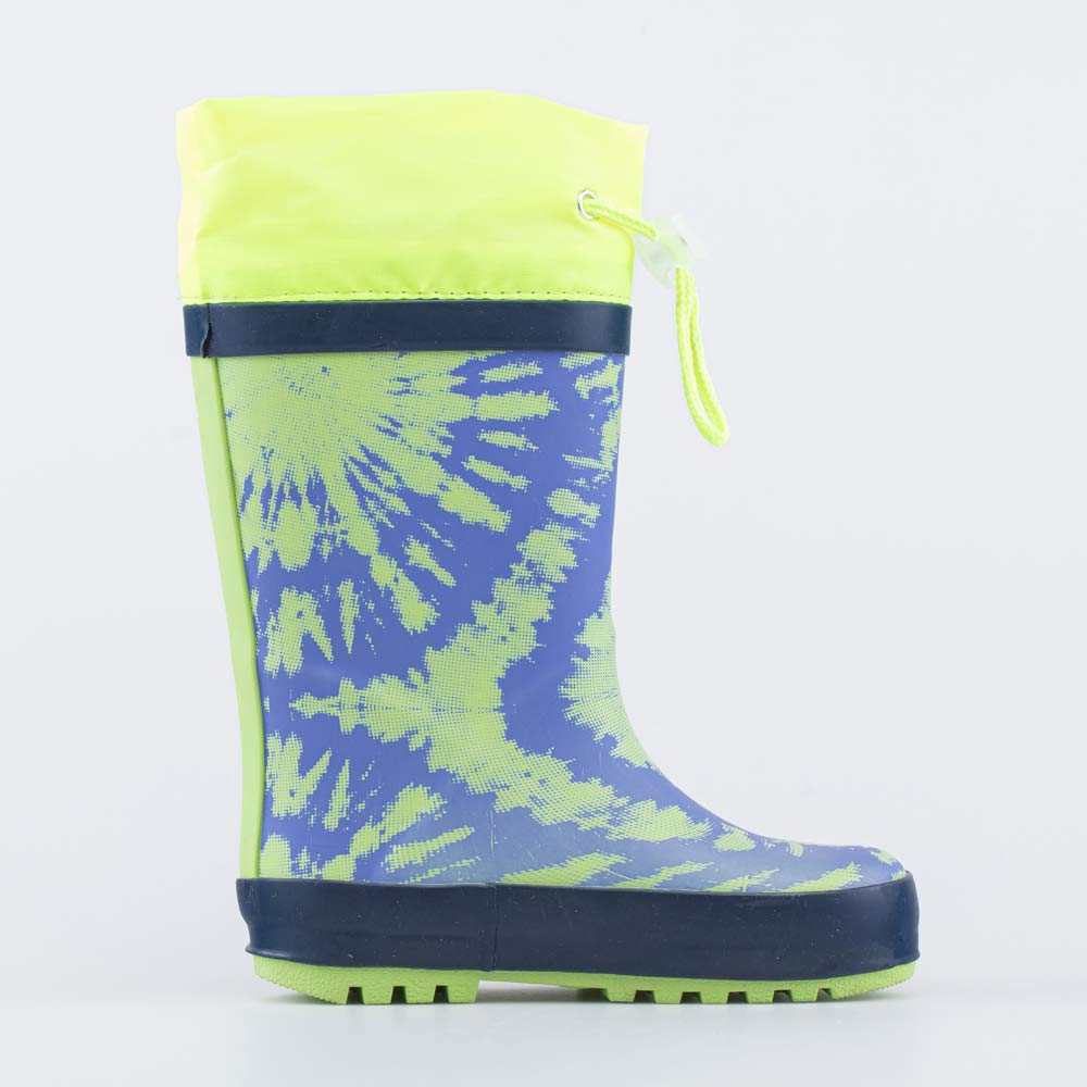 Детские резиновые сапожки. Материал верха и подошвы - водонепроницаемая резина. Подкладка и стелька - из текстиля с содержанием хлопка 80% позволяют коже \'дышать\'. Манжет дополнен утяжкой с фиксатором, что позволяет сохранять ножки ребенка сухими даже во время активных игр на свежем воздухе. Сапожки украшены ярким принтом в цвет манжета. Модель имеет анатомически правильную форму следа.