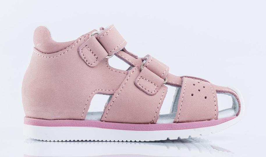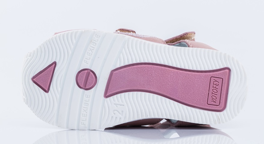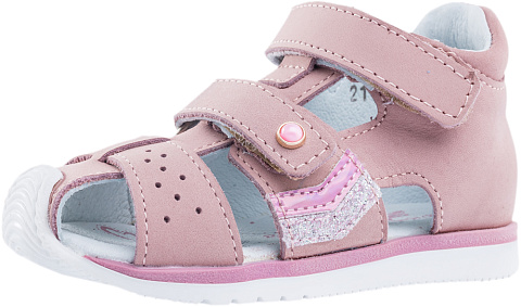 Туфли летние выполнены полностью из натуральной кожи приглушенного розового цвета. Два ремня с велькро(липучкой) обеспечивают идеальную посадку по ноге. Мягкий манжет создает комфорт при ходьбе и предотвращает натирание ножки ребенка. Подошва выполнена из прозрачного термоэластопласта с блёстками – легкого, прочного материала, обладающего отличным амортизирующим свойством. Подошва имеет наплыв в носочной части, что увеличит долговечность сандалий и надолго сохранит приятный внешний вид.