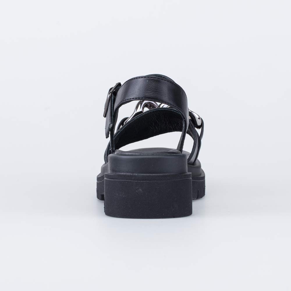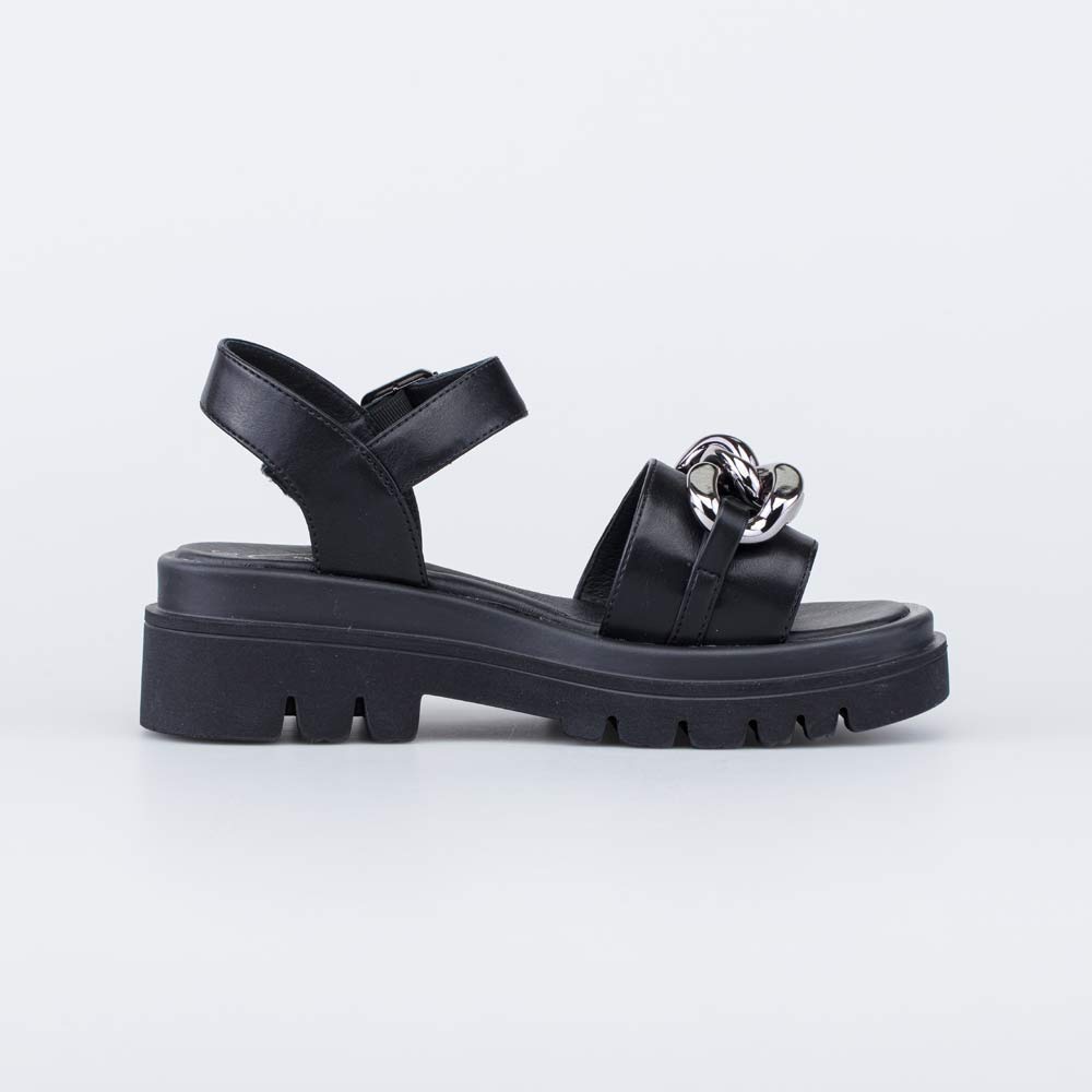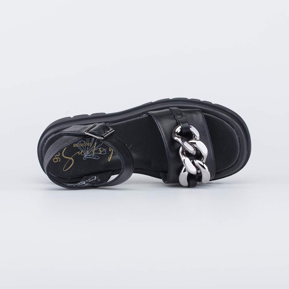Сандалии для девочки с подкладкой из натуральной кожи Верх обуви выполнен из искусственной кожи. Подкладка и стелька из 100% натуральной кожи - износостойкого, гипоаллергенного и дышащего материала. Модель максимально открытая, подходит для жаркой погоды. Обувь на ноге фиксируется при помощи ремешка с пряжкой. Подошва изготовлена из ПУ (полиуретана) - гибкая, эластичная, амортизирующая и износостойкая. Модель выполнена в классическом черном цвете, поэтому ее легко сочетать с любой одеждой. Внимание привлекает массивная рельефная подошва и декоративный элемент в носочной части. Модель анатомически правильная: имеет небольшой каблучок, подсводник (супинатор). Это положительно влияет на правильное развитие стоп и всего опорно-двигательного аппарата.