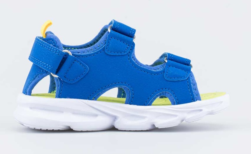 Туфли летние пляжные изготовлены из искусственной кожи со вставками из текстиля. -Открытый носик и пятка имеющая дополнтельные сквозные отверстия позволяют стопе дышать. -Подкладка из текстиля с содержанием хлопка обеспечит ногам комфорт и уют. -Застежка- три \'велькро\' позволяют легко обувать и снимать обувь, а также регулировать посадку на ступне. - Подошва из материала ЭВА позволяет добиться необходимой легкости, мягкости и эластичности, надежного скрепления ее с верхом обуви. Метод крепления подошвы - клеевой. -Модель оснащена мигающими лампочками с яркими светодиодами. Лампочки включаются датчиком, реагирующим на ударные нагрузки, возникающие при ходьбе. - Сандали легко моются и быстро сохнут Модель декорирована принтом.