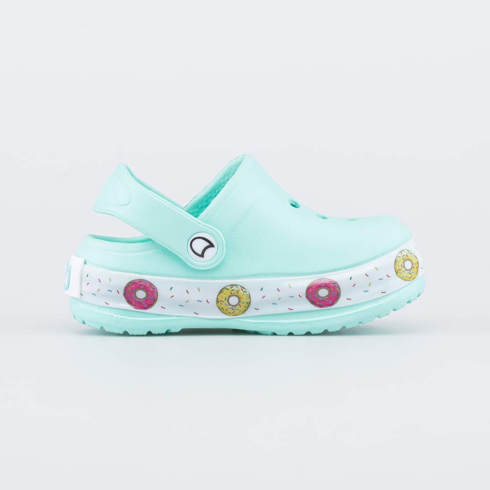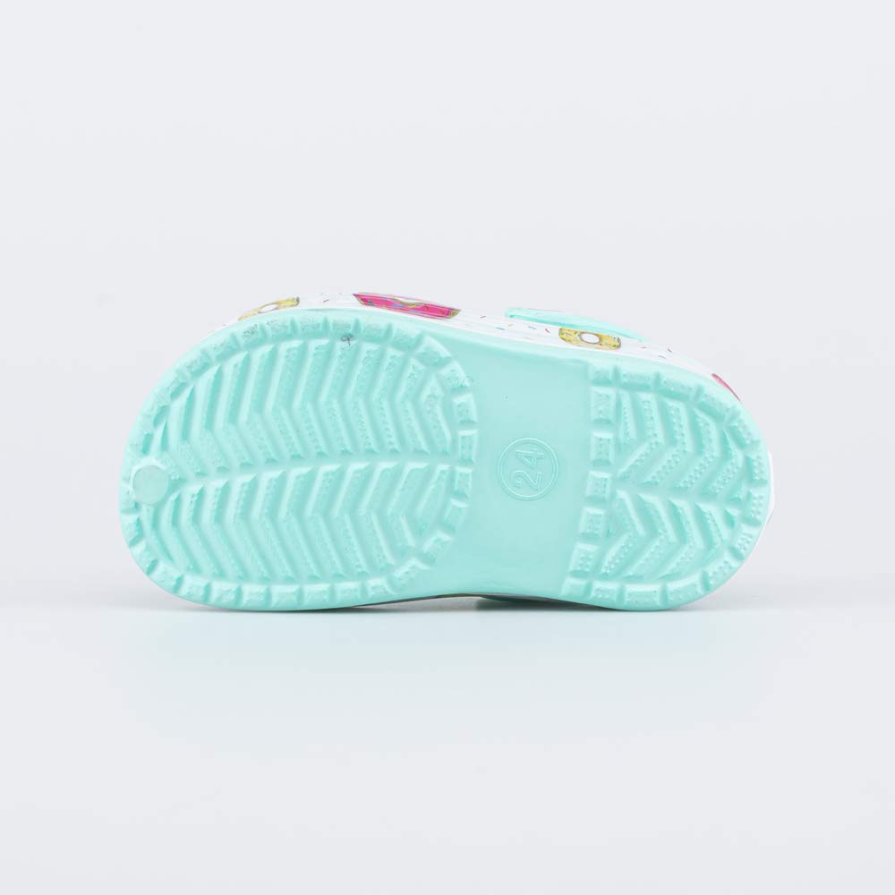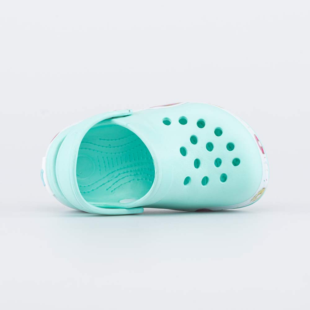 Лёгкие и удобные пляжные сабо для девочки Обувь полностью выполнена из материала ЭВА (этиленвинилацетата) - очень лёгкого, гибкого, эластичного и амортизирующего. Он быстро сохнет и его легко мыть. Закрытый носок защищает пальцы от горячего песка и камней, при этом перфорация позволяет стопе \'дышать\'. Перекидной ремешок надежно фиксирует обувь на ноге. Внимание привлекает красочный принт по периметру подошвы. Обувь оснащена светодиодами, мигающими при ходьбе. Сабо можно украсить стильными декоративными элементами - котофишками.