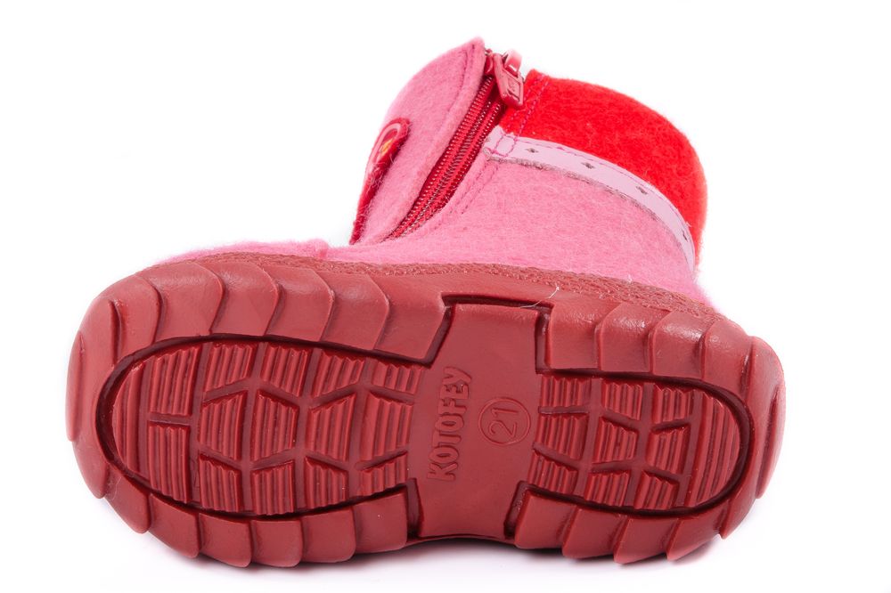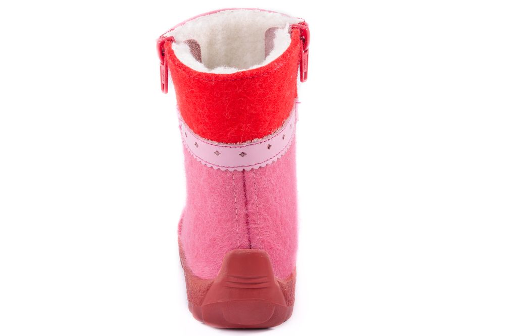 Сапожки войлочные (валенки) выполнены в сочетании материалов: войлок толщиной 4 мм и мех из натуральной овечьей шерсти на трикотажной основе. Обладают повышенными теплозащитными свойствами. Толстая подошва из ТЭП с глубоким протектором предотвращает скольжение. Благодаря наличию двух молний, позволяющих быстро и легко обувать на малыша, модель является неизменным лидером продаж нескольких сезонов.