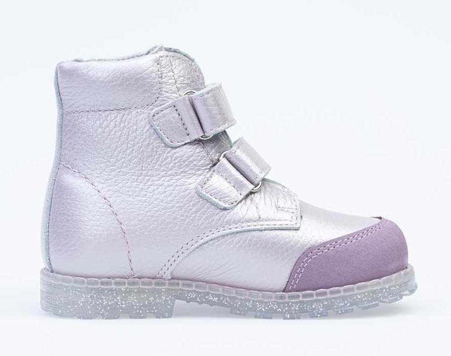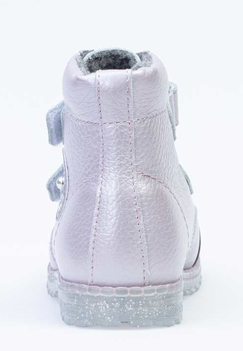 Удобные ботинки из натуральной кожи дополнены аппликацией на берце в виде ракушки с жемчугом. Утепленная подкладка-байка с содержанием шерсти более 80% сохраняет тепло. Два ремня с липучкой позволяют не только быстро обувать и снимать обувь, но и обеспечивают плотное прилегание обуви к стопе. Мягкий кожаный манжет создает комфорт при ходьбе и предотвращает натирание ножки ребенка. Дополнительную защиту от осенней прохлады придаёт войлочная стелька, которую можно вытащить для просушки, воспользовавшись специальной петлёй. В носочной части есть дополнительная кожаная накладка с полиуретановым покрытием для увеличения износостойкости.Подошва клеевая, с небольшим каблучком, выполнена из прозрачного термоэластопласта с блёстками – легкого, прочного материала, обладающего отличным амортизирующим и теплосберегающим эффектом. Эта модель сочетает яркую, но благородную расцветку со стильным дизайном и удобством.