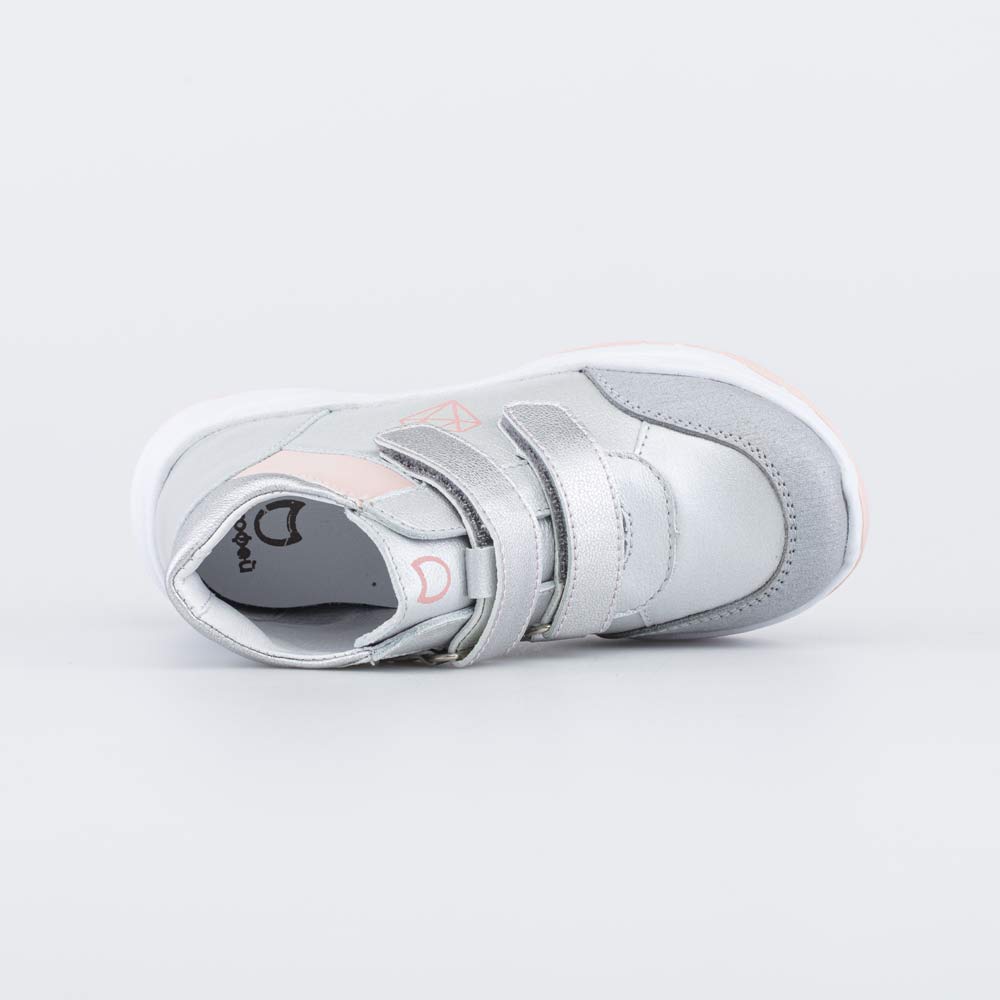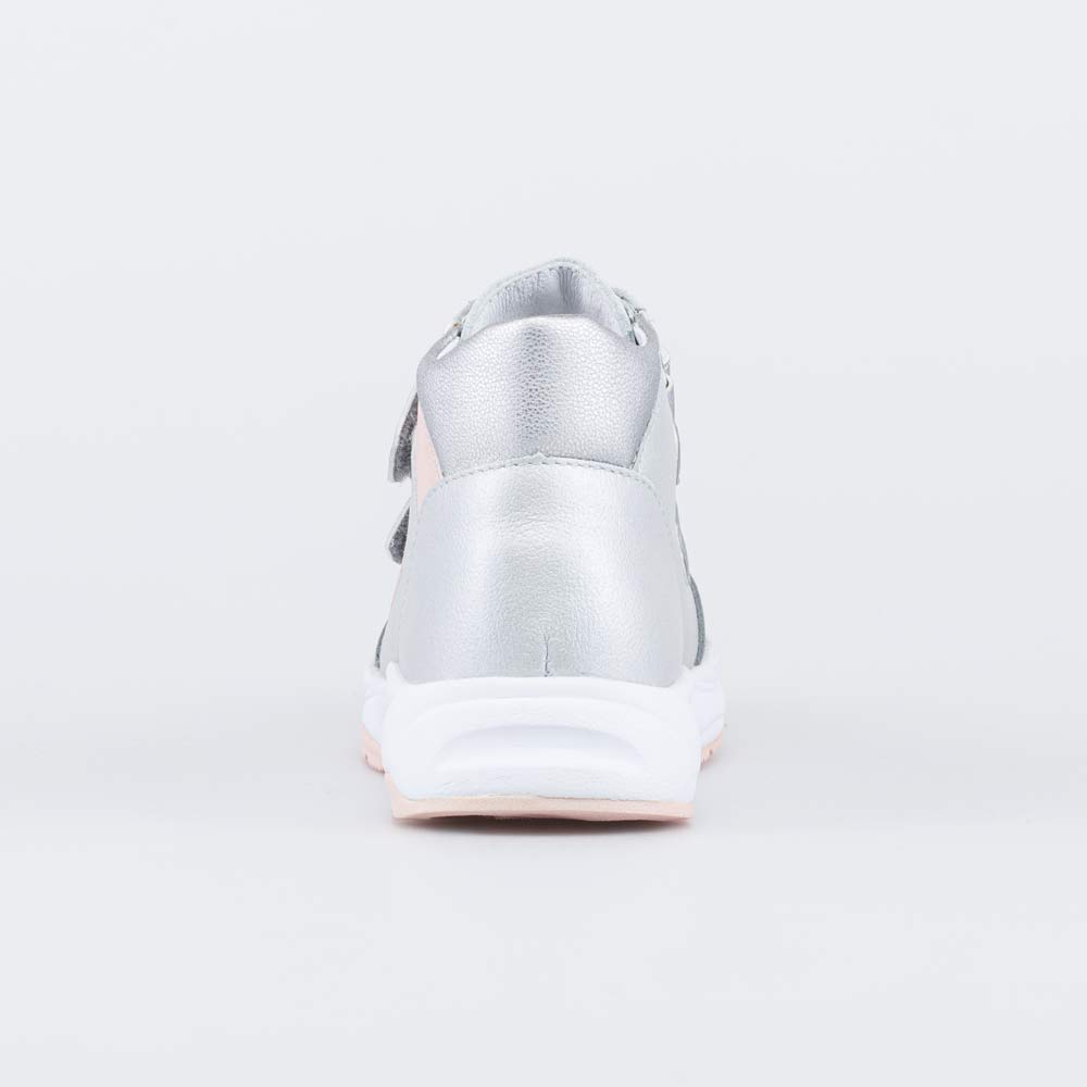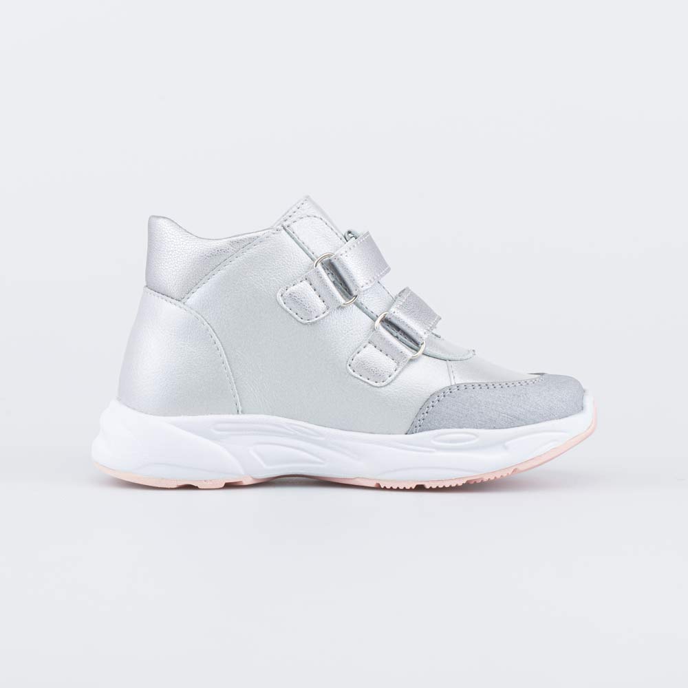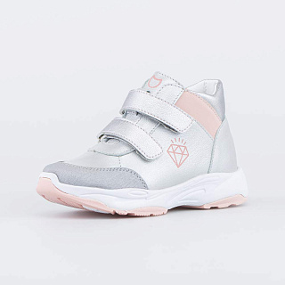 Ботинки для девочки выполнены в нежном серебристом цвете. Верх, подкладка и стелька изготовлены из натуральной кожи. Неубиваемые накладки защищают носочную часть от повреждений. Ремешки с липучками позволяют быстро обуваться и разуваться, а за счет легкого металлического блеска придают модельке изюминку. Дополнительный штрих вносит небольшой принт в виде кристалла. Подошва модной кроссовочной формы выполнена из очень легкого материала ЭВА, который усилен накладками из термоэластопласта для придания прочности. Модель отвечает всем требованиям правильной анатомии: пяточка приподнята, носочек круглый, задник в меру жесткий, стелька формованная с подсводником. Все это способствует правильному развитию опорно-двигательного аппарата. Размеры 21-24 см. 152365-22 Сделано в России, Егорьевск.