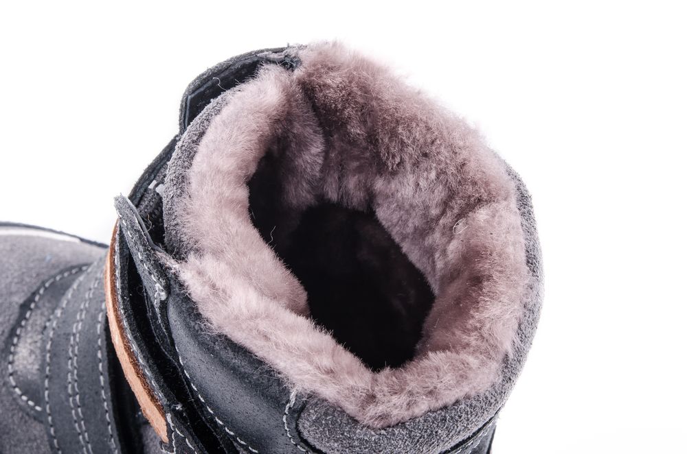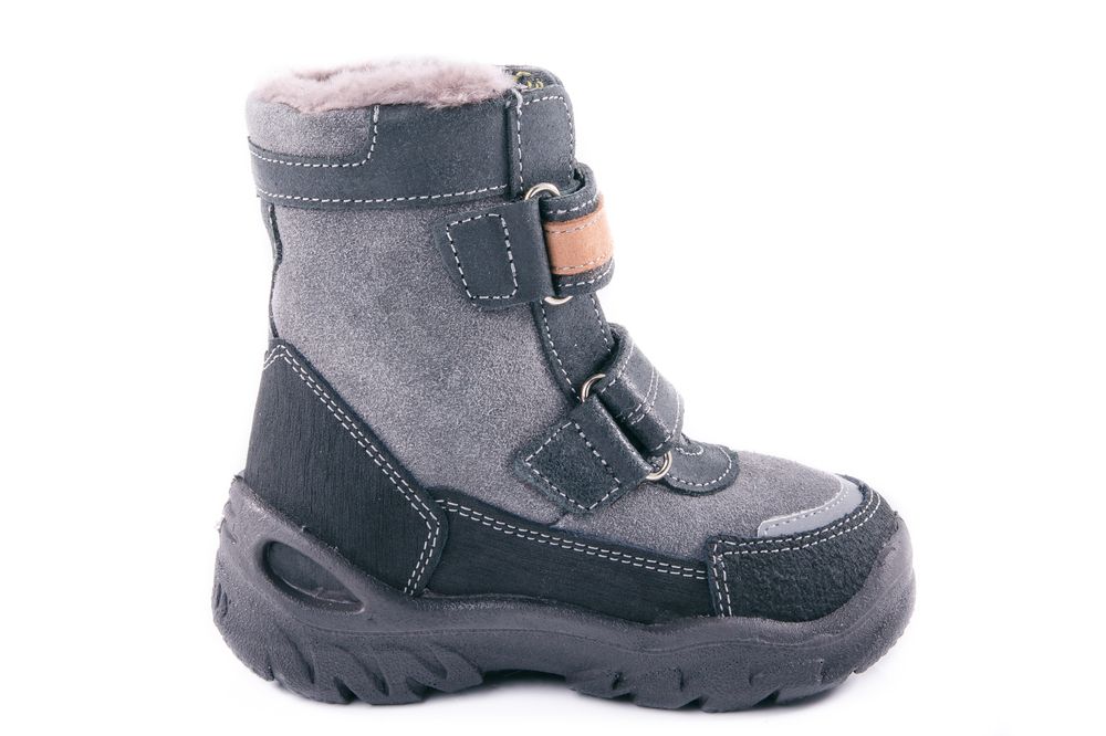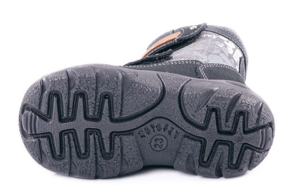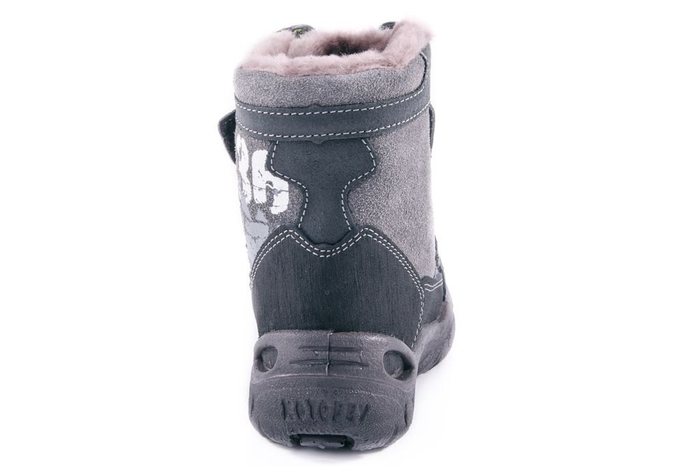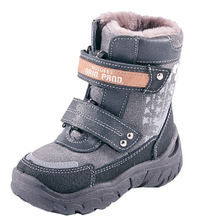 Зимние ботинки для мальчика. Материал верха – натуральная кожа, обладающая хорошими гидрофобными свойствами. Подкладка из натурального меха и вкладная стелька из войлока создают надежную теплозащиту. Легкая, гибкая подошва из специального «зимнего» полиуретана не скользит на морозе. Применение литьевого метода крепления подошвы, при котором в наибольшей степени учитываются анатомические особенности стопы, обеспечивает модели максимальную прочность, необходимую пластичность и минимальный вес. Пяточная и носочная части защищены натуральной кожей с полиуретановым покрытием. Модель имеет светоотражающий элемент на союзке. В качестве отделки использован стильный принт и металлические клепки на ремнях.