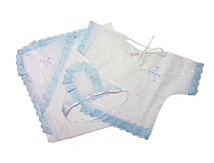 В комплект входят: пеленка с уголком, рубашка, чепчик.