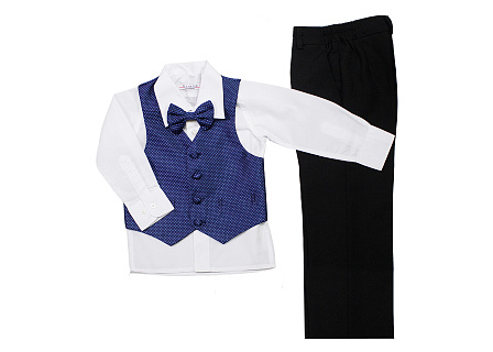 - костюм представляет собой брючки, белую рубашку и жилетку элеганной геометрической расцветки