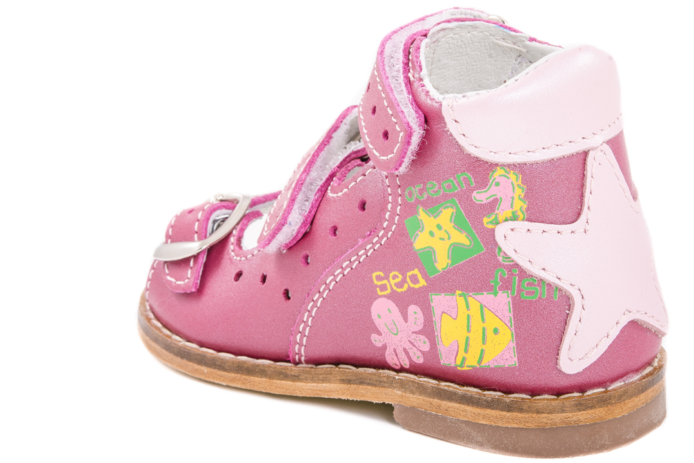 Туфли летние из коллекции «Первые шаги» произведены из качественной натуральной кожи в строгом соответствии с ГОСТом. Кожаная подошва, благодаря вставкам из термополиуретана (ТПУ), не скользит. Дополнена невысоким каблучком (прим.5-7мм), присутствие которого обеспечивает ножке малыша правильное развитие. Есть небольшой подсводник. Жесткий задник хорошо фиксирует пятку и предотвращает нежелательные боковые движения. Носочная часть защищена широким вдольподъемным ремнем. Три застежки–липучки позволяют отрегулировать обувь по полноте. Модель максимально открыта, что позволяет ножке малыша «дышать» и чувствовать себя комфортно.