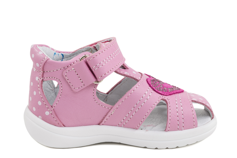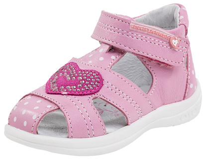 Нарядные сандалии изготовлены специально для Вашей малышки! Модель выполнена из натуральной кожи, что обеспечит полный комфорт ножке ребенка. Закрытые пяточная и носочная части помогают правильно фиксировать стопу ребенка и защищают ногу от повреждений. Подошва модели изготовлена из полиуретана, благодаря чему модель отличается малым весом. На ноге модель крепится при помощи ремня с застежкой велькро, что позволяет легко и быстро обувать и снимать сандалии. Модель украшена нашивкой сердце с яркими стразами.