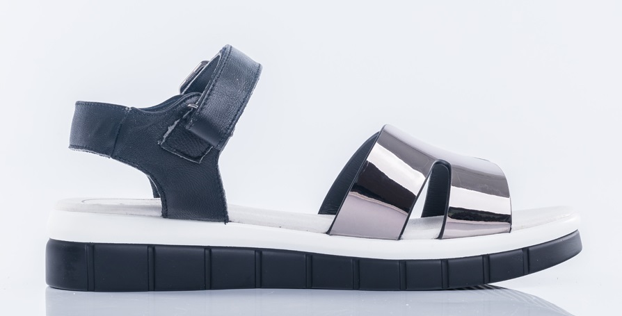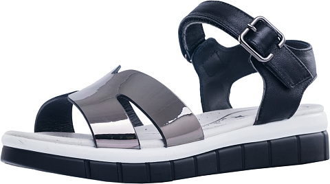Модные босоножки - отличный выбор для юной модницы! Стелька из мягкой нежной натуральной кожи добавит комфорта ножкам! Ремень с застежкой надежно фиксирует модель на ноге. Подошва очень устойчивая, современная, практичная и удобная. Сочетание тренд \'БЛЕСК\' и черного цветов подойдет к любому летнему гардеробу модницы. Стильные босоножки станут прекрасным завершением образа.