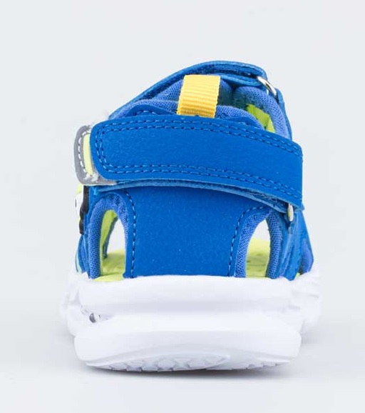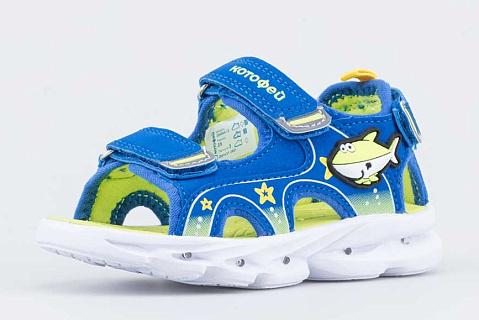 Туфли летние пляжные изготовлены из искусственной кожи со вставками из текстиля. -Открытый носик и пятка имеющая дополнтельные сквозные отверстия позволяют стопе дышать. -Подкладка из текстиля с содержанием хлопка обеспечит ногам комфорт и уют. -Застежка- три \'велькро\' позволяют легко обувать и снимать обувь, а также регулировать посадку на ступне. - Подошва из материала ЭВА позволяет добиться необходимой легкости, мягкости и эластичности, надежного скрепления ее с верхом обуви. Метод крепления подошвы - клеевой. -Модель оснащена мигающими лампочками с яркими светодиодами. Лампочки включаются датчиком, реагирующим на ударные нагрузки, возникающие при ходьбе. - Сандали легко моются и быстро сохнут Модель декорирована принтом.