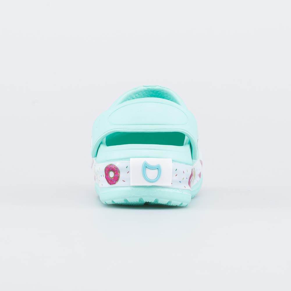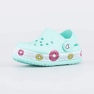 Лёгкие и удобные пляжные сабо для девочки Обувь полностью выполнена из материала ЭВА (этиленвинилацетата) - очень лёгкого, гибкого, эластичного и амортизирующего. Он быстро сохнет и его легко мыть. Закрытый носок защищает пальцы от горячего песка и камней, при этом перфорация позволяет стопе \'дышать\'. Перекидной ремешок надежно фиксирует обувь на ноге. Внимание привлекает красочный принт по периметру подошвы. Обувь оснащена светодиодами, мигающими при ходьбе. Сабо можно украсить стильными декоративными элементами - котофишками.