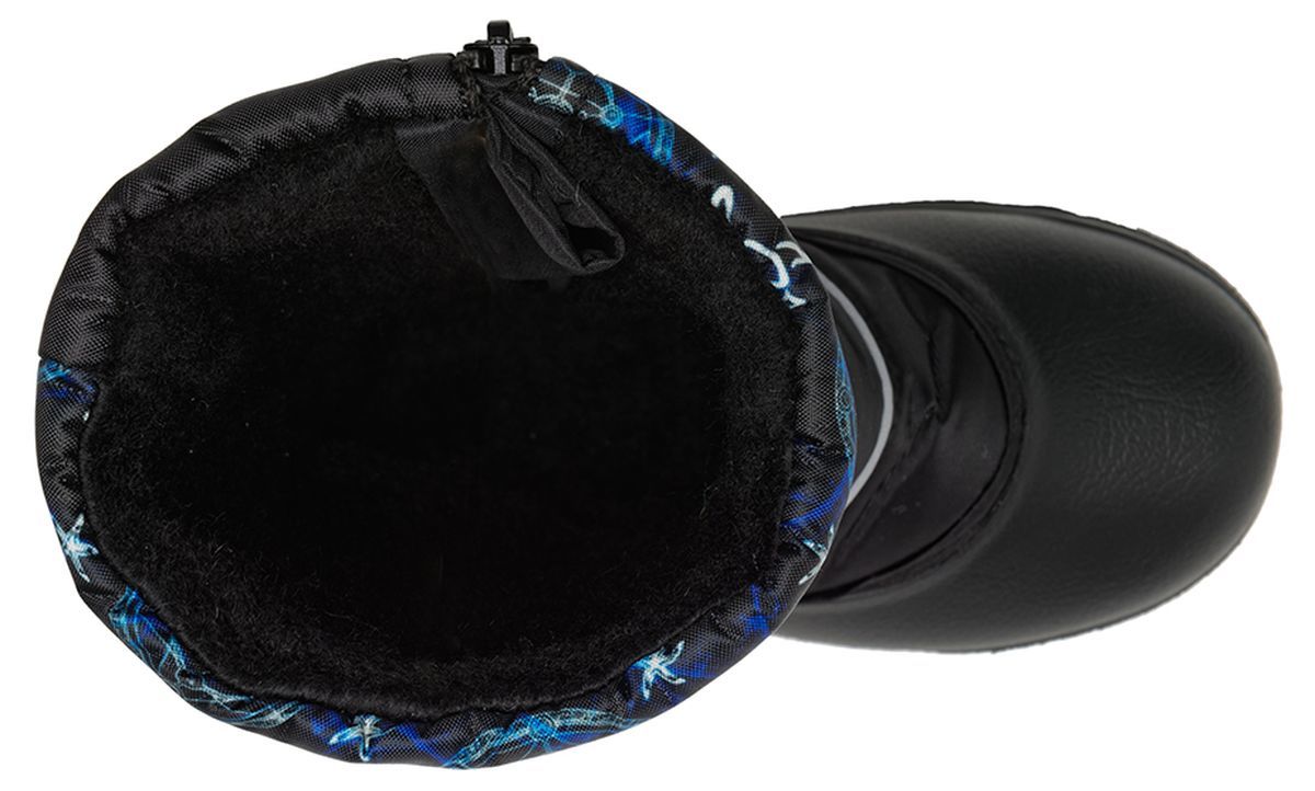 Верхняя часть сноубутсов выполнена из ткани с водоотталкивающей пропиткой. Для обеспечения безопасности в тёмное время суток, предусмотрен светоотражающий кант. Низ сапожек изготовлен из эластичного полимера с высокой термостойкостью. Для более плотного прилегания к детской ножке и дополнительного удобства предусмотрена застёжка молния. Протектор подошвы обеспечивает устойчивость при ходьбе и сцепляемость с любой поверхностью.