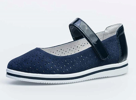 Стильные туфли-лодочки для девочки красивого синего цвета с верхом и подкладкой из натуральной кожи и натурального велюра. - Модель со сквозной перфорацией, что создает дополнительную вентиляцию кожи стоп. - Мягкий манжет создает комфорт при ходьбе и предотвращает натирание ножки ребенка. - Ремешок с липучкой (велькро) удобно фиксирует обувь на стопе. - Туфли подходят как для торжественных мероприятий, так и для повседневной носки. Данная модель анатомически правильная: имеет небольшой каблучок, подсводник и жёсткий задник - что положительно влияет на правильное развитие стоп ребенка.