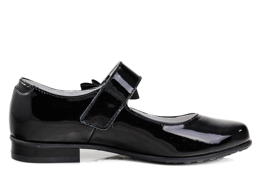 Классические туфли лаконичного дизайна. Модель выполнена из натуральной кожи с естественной лицевой поверхностью, специальной блестящей отделкой и обладает эффектом ломаной разбивки, что не является дефектом в обуви, а является особенностью данного кожтовара. Модель крепится на ноге при помощи ремня с застежкой велькро. Подошва модели клеевая, дополнена небольшим каблучком. Стелька из натуральной кожи, дублированная мягким вспененным материалом, обладает свойствами гигроскопичности и воздухопроницаемости, что обеспечит полный комфорт ножке в течение всего дня. Украшение на ремне в виде атласного банта придает модели нарядности.