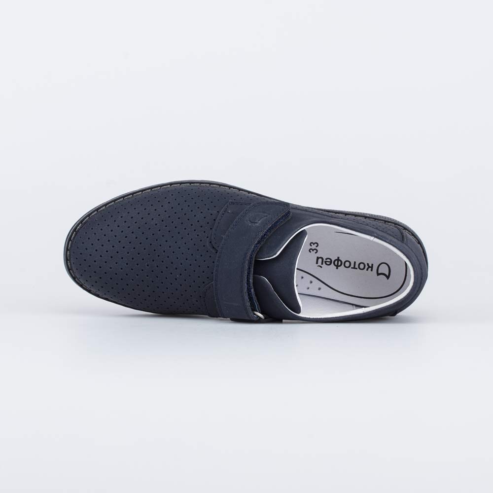 Кожаные туфли для мальчика синего цвета Верх, подкладка и стелька выполнены из натуральной кожи - износостойкого, гипоаллергенного и дышащего материала. Дополнительную вентиляцию обеспечивает перфорация. Липучки-велькро позволяют быстро обуваться и разуваться. Подошва из ТЭП (термоэластопласта) - прочная, гибкая и амортизирующая. Благодаря лаконичному дизайну, модель отлично подходит для повседневной носки в школу. Модель анатомически правильная: имеет небольшой каблучок/танкетку, подсводник (супинатор), в меру жёсткий задник и круглый носок. Такая научно-обоснованная конструкция положительно влияет на правильное развитие стоп и всего опорно-двигательного аппарата.