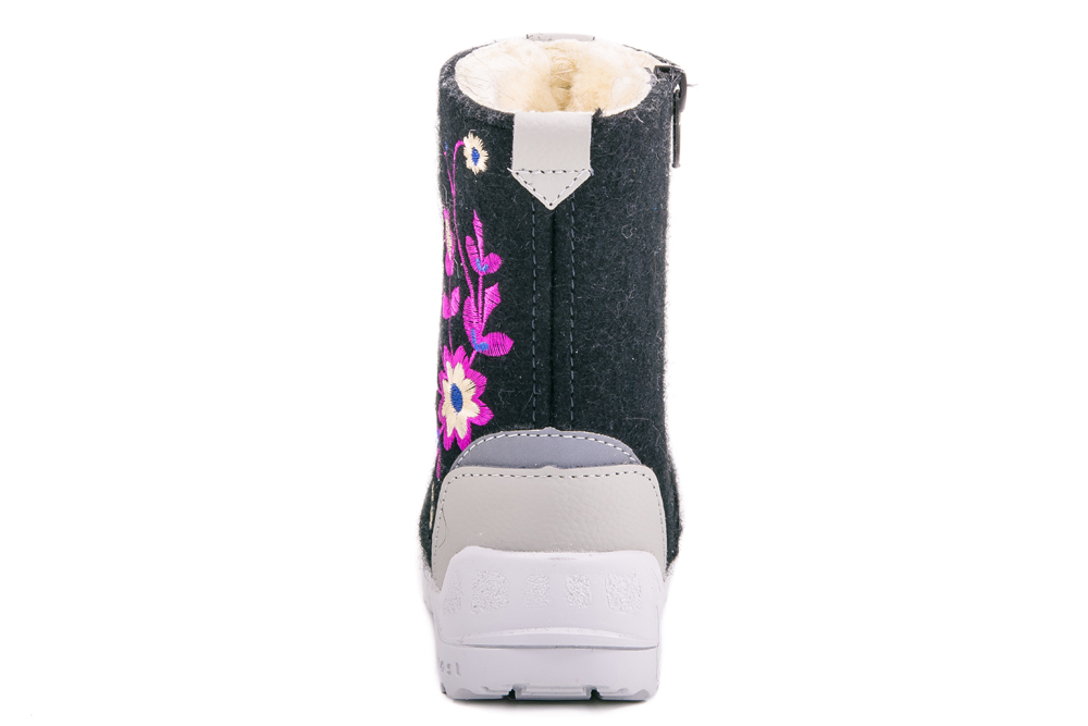Валенки из отечественного натурального войлока с подкладкой из шерстяного меха обладают наивысшими теплозащитными свойствами. Подошва модели имеет специальную вставку, теплопроводность которой ниже, чем теплопроводность воздуха на 72%. Соответственно, такая подошва лучше удерживает тепло и препятствует переохлаждению стопы по сравнению с обычной подошвой. Глубокий протектор подошвы предотвращает скольжение. Дополнительную защиту от прохлады придаёт толстая войлочная стелька, которую можно вытащить для просушки, воспользовавшись специальной петлёй. Застежка – молния. Носочная и пяточная части защищены спилком с полиуретановым покрытием и дополнены светоотражающими вставками. Модель в стиле «Russian folk». Эффектная, яркая цветочная вышивка делает ее нарядной и привлекательной для маленьких модниц.