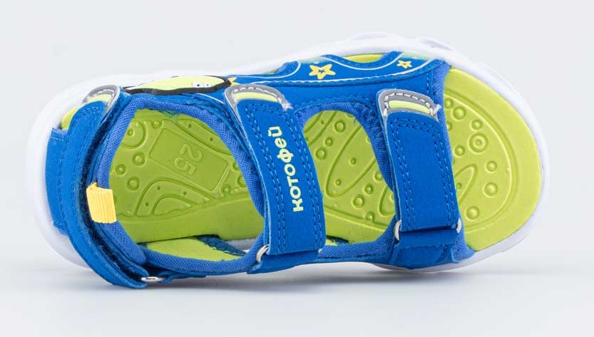 Туфли летние пляжные изготовлены из искусственной кожи со вставками из текстиля. -Открытый носик и пятка имеющая дополнтельные сквозные отверстия позволяют стопе дышать. -Подкладка из текстиля с содержанием хлопка обеспечит ногам комфорт и уют. -Застежка- три \'велькро\' позволяют легко обувать и снимать обувь, а также регулировать посадку на ступне. - Подошва из материала ЭВА позволяет добиться необходимой легкости, мягкости и эластичности, надежного скрепления ее с верхом обуви. Метод крепления подошвы - клеевой. -Модель оснащена мигающими лампочками с яркими светодиодами. Лампочки включаются датчиком, реагирующим на ударные нагрузки, возникающие при ходьбе. - Сандали легко моются и быстро сохнут Модель декорирована принтом.