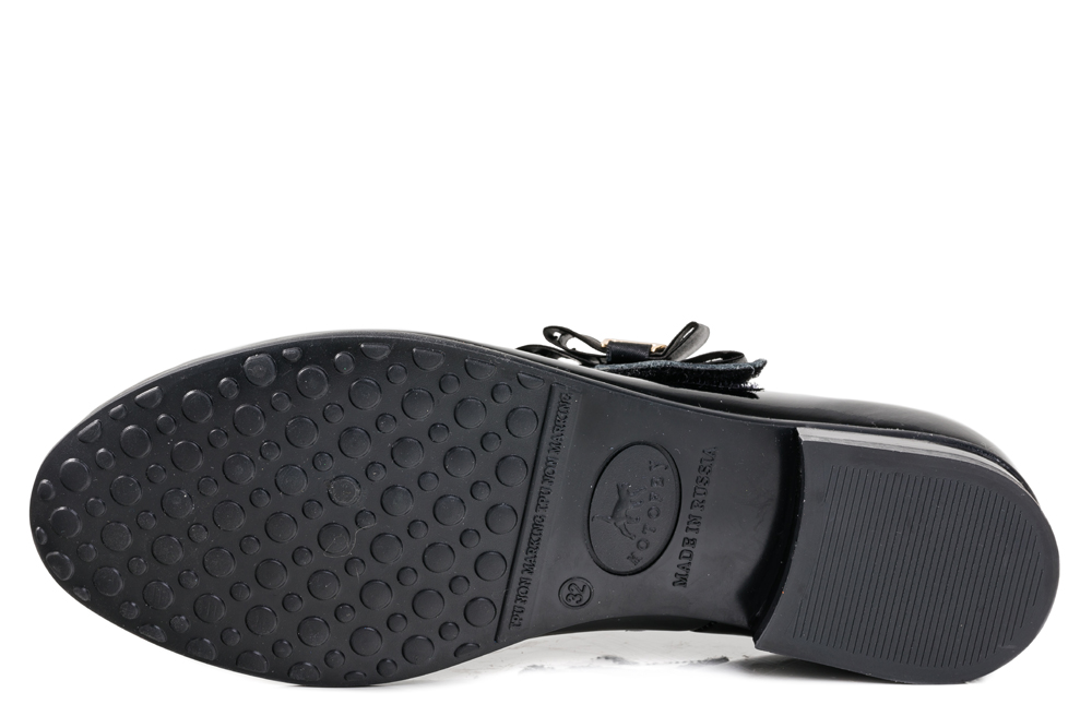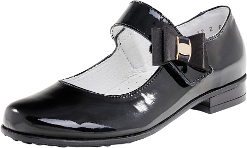Классические туфли лаконичного дизайна. Модель выполнена из натуральной кожи с естественной лицевой поверхностью, специальной блестящей отделкой и обладает эффектом ломаной разбивки, что не является дефектом в обуви, а является особенностью данного кожтовара. Модель крепится на ноге при помощи ремня с застежкой велькро. Подошва модели клеевая, дополнена небольшим каблучком. Стелька из натуральной кожи, дублированная мягким вспененным материалом, обладает свойствами гигроскопичности и воздухопроницаемости, что обеспечит полный комфорт ножке в течение всего дня. Украшение на ремне в виде атласного банта придает модели нарядности.